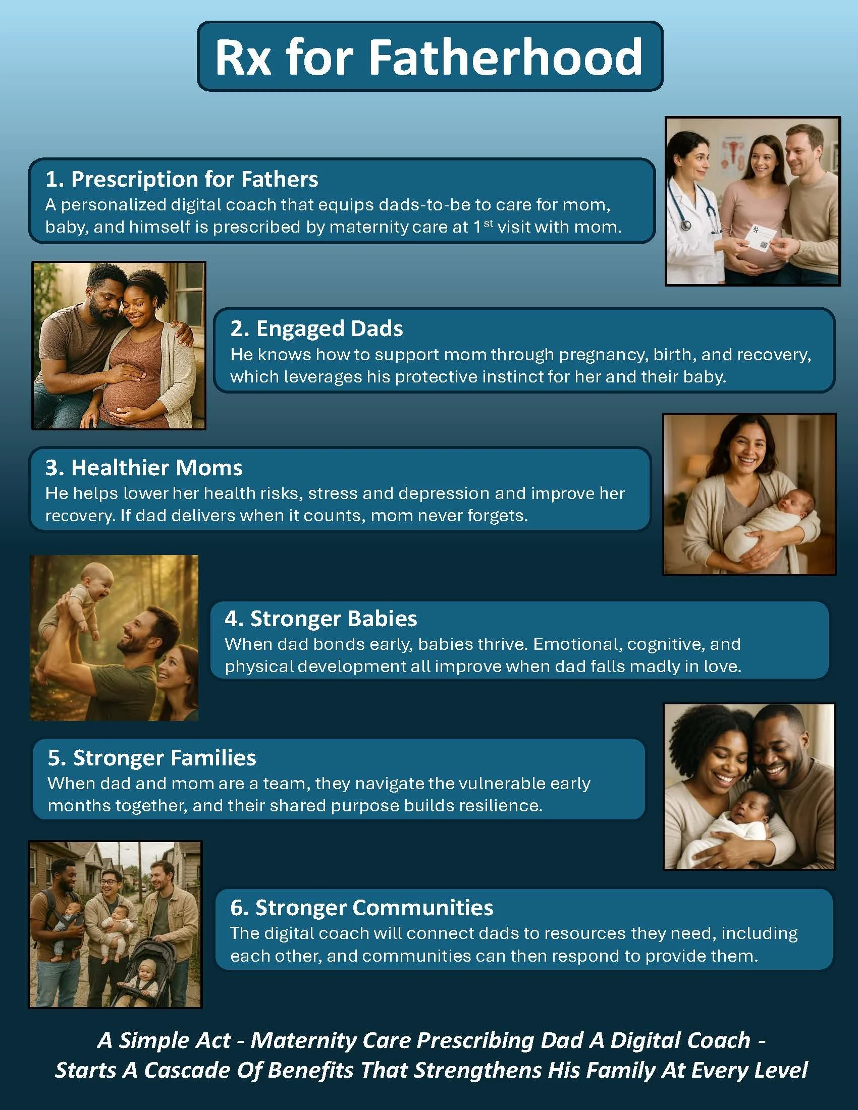 This work introduces a new approach: partnering maternity care with fathers at the moment they are most motivated to step up, then connecting them to a growing network of community and peer support. The result is a ripple effect that strengthens families, builds community infrastructure, and unlocks one of the most overlooked opportunities in maternal and child health.